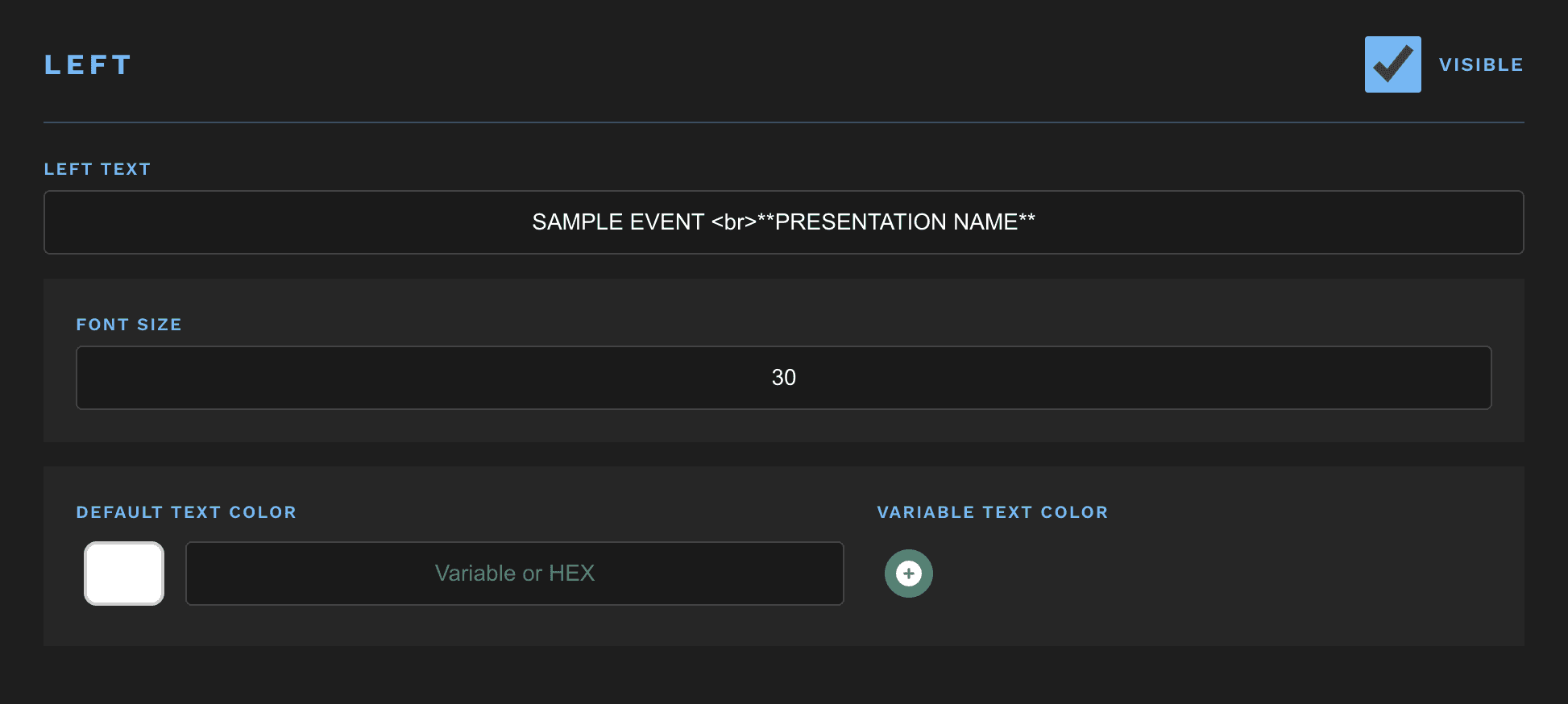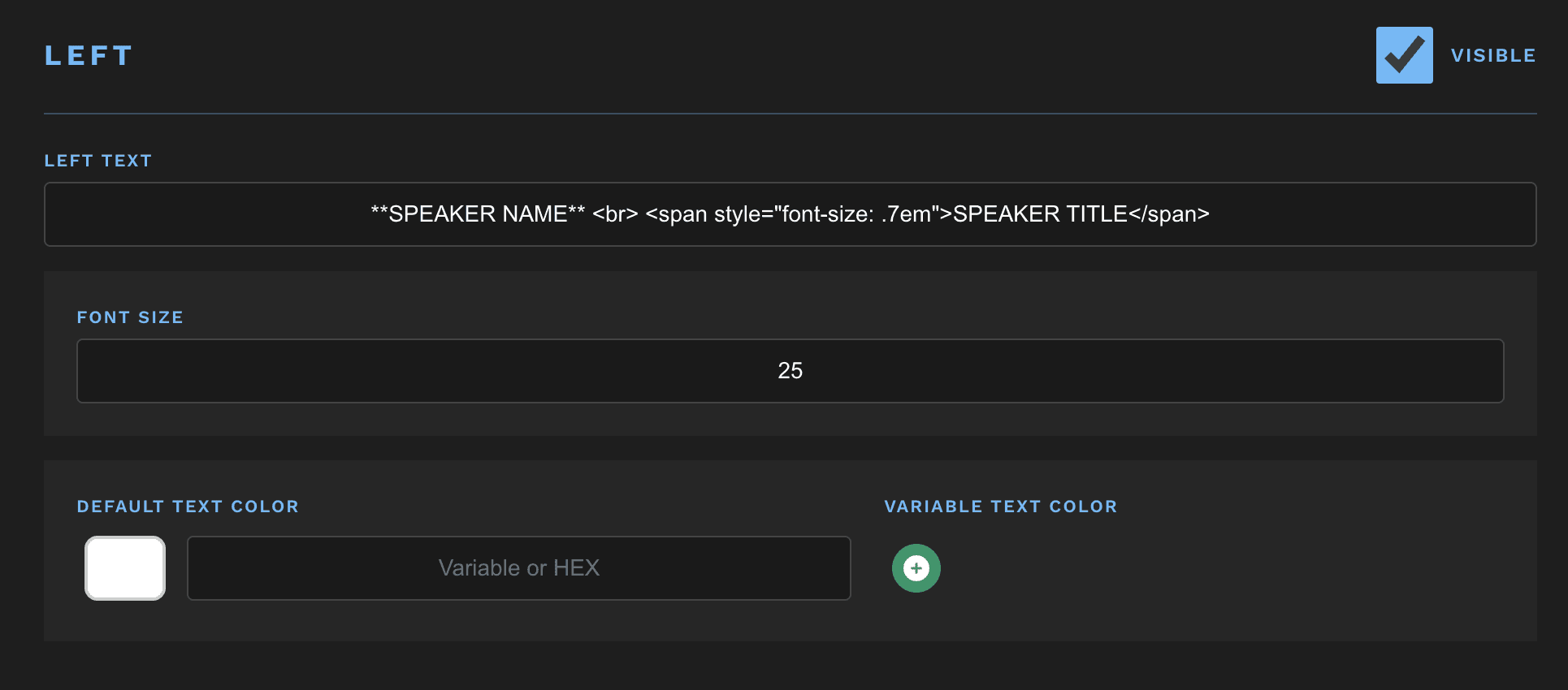 Similar to the event and presentation name, the presenter name and title also show just the left text with a blank right text enabled so that text left justifies. The text uses ** to bold the presentation name, <br> to create a line break, and a <span> with a font-size style parameter to make the speaker title slightly smaller than the speaker name.